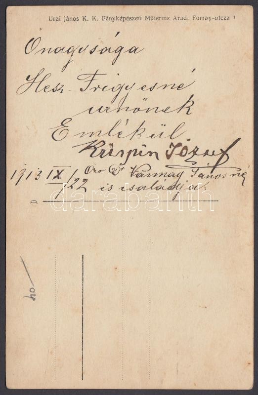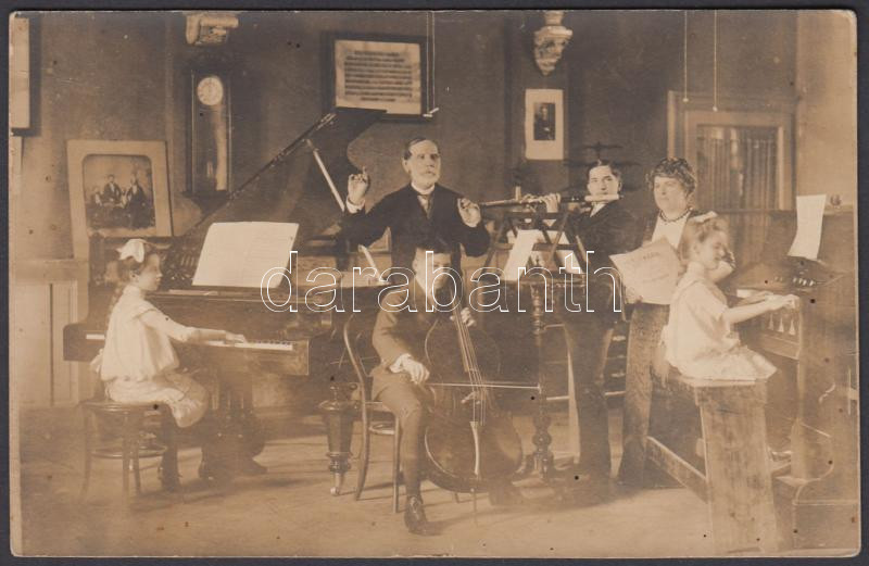 1913 Urai János (Arad): Családi házi zenekar, Krispin József zenetanár és szabadkőműves aláírásával, aki az aradi Szabadkőműves Összetartás Páholy alapító tagja volt, feliratozott, dedikált fotólap, 9x14 cm