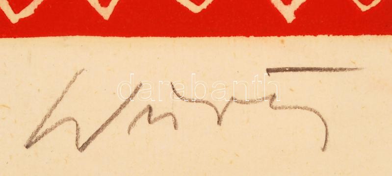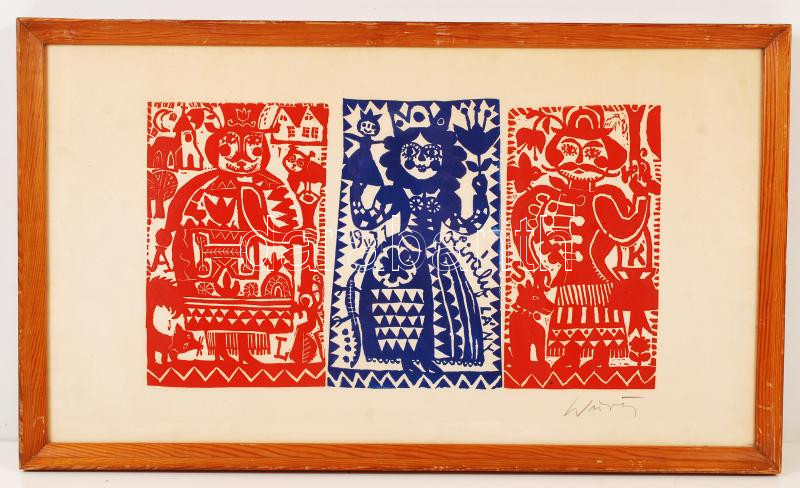Beschreibung: Würtz Ádám (1927-1994): Király lány. Színezett linó, papír, jelzett, üvegezett keretben, 22×39 cm