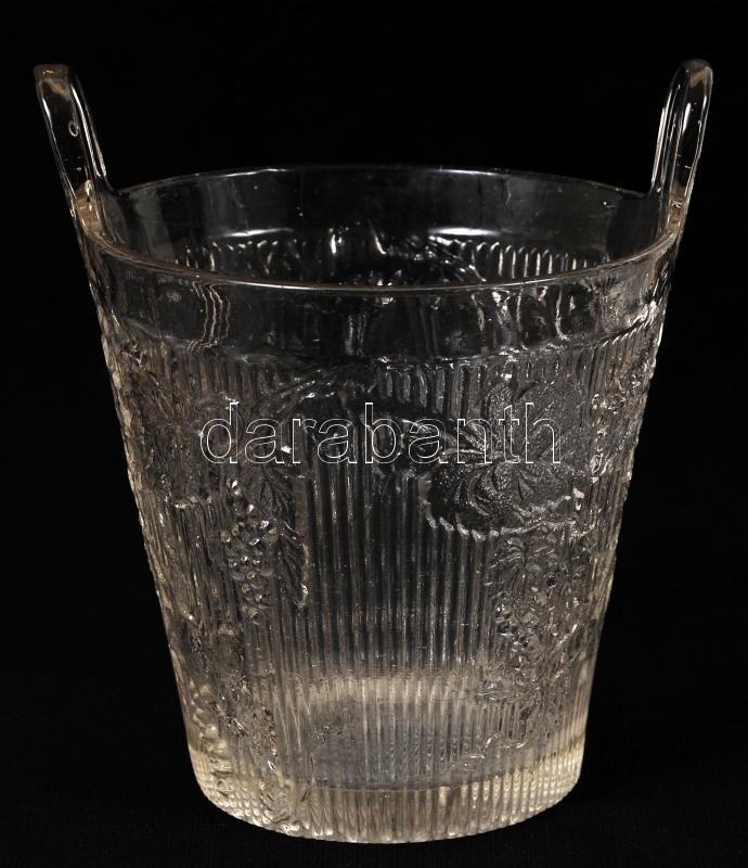 Beschreibung: 1 db szüretelő dézsa alakú üvegtál, oldalán szőlőmotívumos díszítéssel, alján kisebb kopásokkal, d: 8-12 cm, m: 15,5 cm