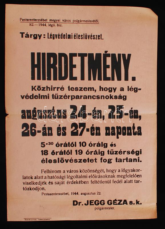 1944 Pestszenterzsébet, Légvédelmi éleslövészetről szóló hirdetmény, f... https://www.darabanth.com/de/221-Fernauktion/221.0/Andere-Sammelgebiete/Militaria~1600005/1944-Pestszenterzsebet-Legvedelmi-elesloveszetrol-szolo-hirdetmeny-felhivas-a-legolta~II953471