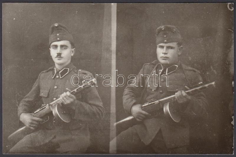 Beschreibung: cca 1945 Hajdú János csongárdi fényképész műtermében készült két katonai fotó dobtáras géppisztollyal, későbbi kontakt másolatok, 9x14 cm