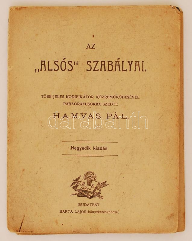 Hamvas Pál (ill. több jeles kodifikátor): Az "alsós" szabályai. Negyed... https://www.darabanth.com/de/222-Fernauktion/222.0/Andere-Sammelgebiete/Bucher-Sonstige-Raritaten~20027/Hamvas-Pal-ill-tobb-jeles-kodifikator-Az-alsos-szabalyai-Negyedik-kiadas-Budapest-19~II961213