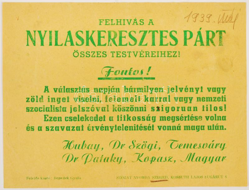 1939 "Felhívás a Nyilaskeresztes Párt összes testvéreihez!" röplap, 15... https://www.darabanth.com/de/222-Fernauktion/222.0/Andere-Sammelgebiete/Drucksachen~20008/1939-Felhivas-a-Nyilaskeresztes-Part-osszes-testvereihez-roplap-15x12-cm~II959822