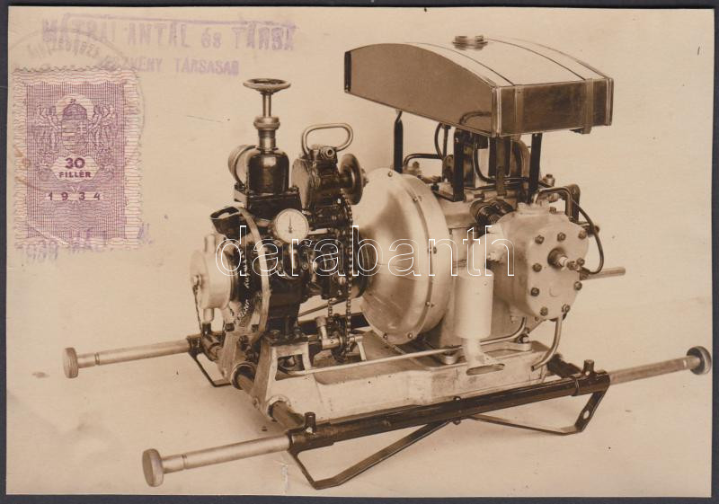 Beschreibung: 1939 május, Mátrai Antal és Társa által gyártott benzinmotoros szivattyú (?) fényképe illetékbélyeggel, kis képszéli szakadással, 10x15 cm