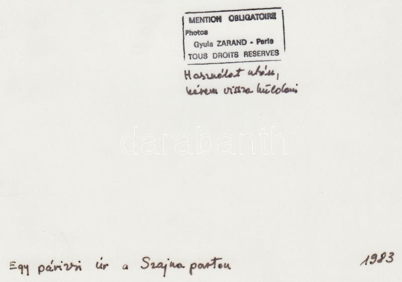 1983 Zaránd Gyula: Egy párizsi úr a Szajna partján, pecséttel jelzett,... https://www.darabanth.com/de/222-Fernauktion/222.0/Andere-Sammelgebiete/Foto~20032/1983-Zarand-Gyula-Egy-parizsi-ur-a-Szajna-partjan-pecsettel-jelzett-feliratozott-vintage-fot~II957991