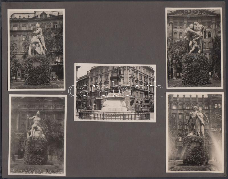 cca 1922-1925 Irredenta vagy Trianon szoborcsoport a Szabadság téren: Észak, Dél, Kelet, Nyugat; középen a Batthyány örökmécses, mögötte a 8-as villamos, 5 db fénykép közös fotóalbumlapra felragasztva, fotóméret 8x6 cm, karton 18x23 cm