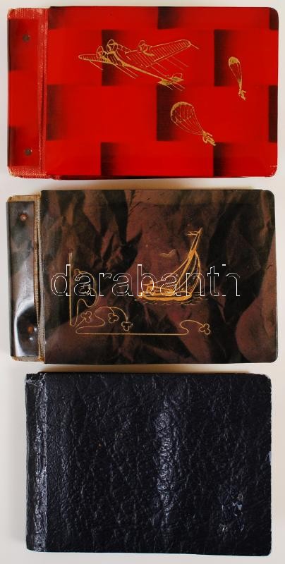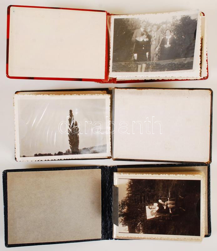 cca 1930-1944 3 db kisméretű fotóalbum vegyes családi fényképekkel, látképekkel több magyarországi és környező országbeli helyszínről (pl. Felsőlövő [Oberschützen, Burgenland, Ausztria], Isaszeg), számos fénykép hátulján feliratozva, többek között Bartók Albert (1912-1992) jogász, helytörténész - Gregor József (1940-2006) operaénekes nevelőapja - és huga, Bartók Magdolna fényképével