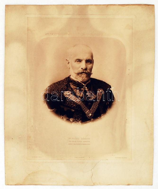 cca Dr. Plósz Sándor (1846-1925) jogász, igazságügy miniszter portréja, réznyomat, felülete tisztítást igényel, képméret 28x22 cm, karton méret 42x34 cm, a karton sérült, ragasztott