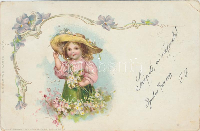 1899 Girl, flower, Kinderpostkarte No. 19. litho (EK) https://www.darabanth.com/de/222-Fernauktion/222.0/Ansichtskarten/Kunstlerkarten~40368/1899-Girl-flower-Kinderpostkarte-No-19-litho-EK~II905393