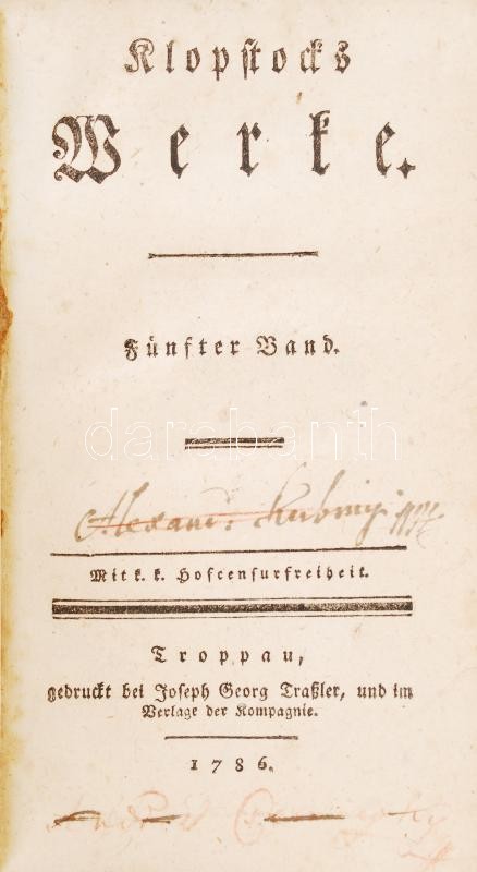 Beschreibung: Klopsters: Werte. Fünfter Band. Troppau, 1786, Joseph Georg Erakler. Félbőr kötésben, díszes, dombornyomott gerinccel, színezett lapszél. Korának megfelelő állapotban.