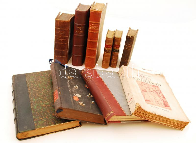Regények francia nyelven, nagy részük szép egész- ill., fél bőr kötésben, bordázott gerinccel. Balzac, Maupassant, Concourt, Faurie, Rebell, Daudet, Legras, Pellico, Vigny. Összeasen 10db