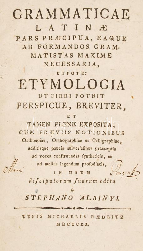 Stephano Albinyi: Grammaticae latin ae pars praecipua, eaque ad formandos grammatistas maxime necessaria utpote:Etymologia ut fieri potiut perspicue, breviter et tamen plene exposita, cum praeviis notionbus. MDCCCXX, Michaelis Raedlitz. Félbőr kötésben, kissé viseltes fedőborítóval.
