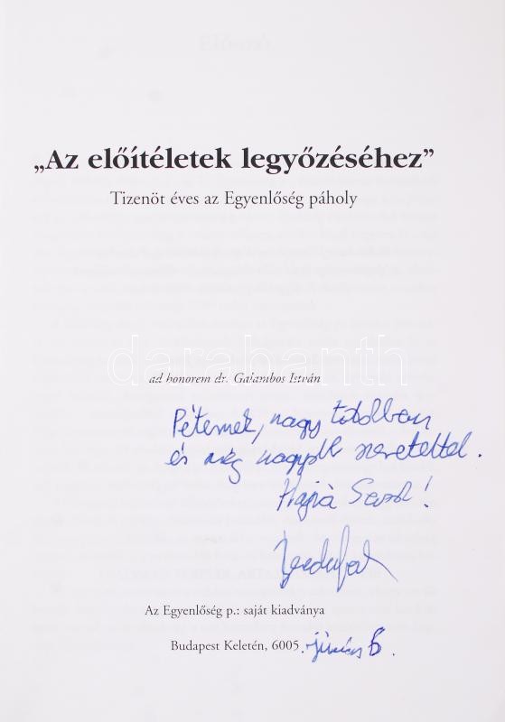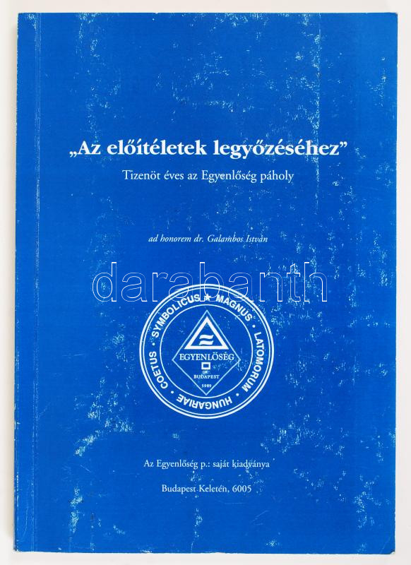 "Az előítéletek legyőzéséhez". Tizenöt éves az Egyenlőség páholy. Ad honorem dr. Galambos István. Budapest Keletén, 6005, Az egyenlőség p.:saját kiadványa. Belső használatra készült szabadkőműves kiadvány. Kiadói papír kötésben. Tulajdonosi ajánlással.