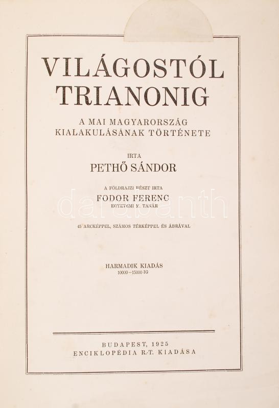 Pethő Sándor: Világostól Trianonig. A mai Magyarország kialakulásának története. A földrajzi részt írta Fodor Ferenc. Bp., 1925, Enciklopédia Rt. Kicsit kopott gerincű vászonkötésben, egyébként jó állapotban.