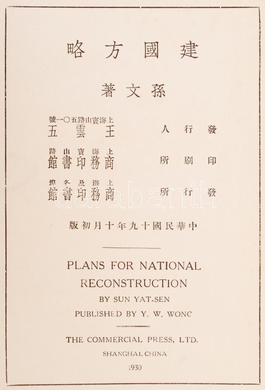 Sun Yat-Sen: Plans for national reconstruction. Shanghai, 1930. In Chinese. In linen binding, in good condition. /
