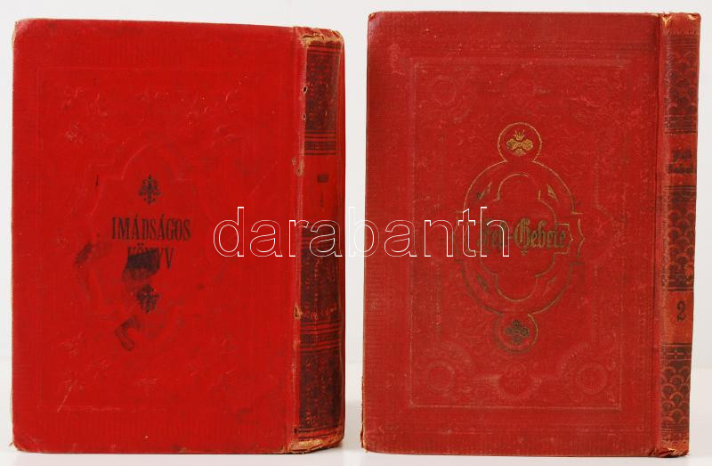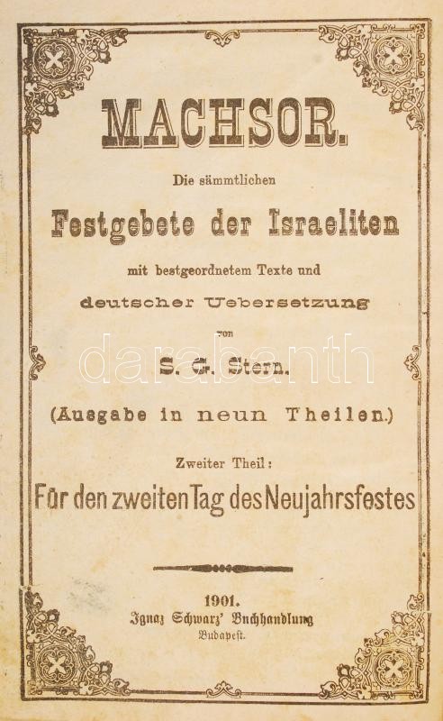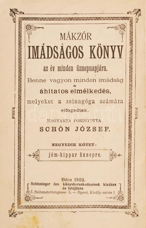 2 db imádságos könyv-Mákzór imádságos könyv az év minden ünnepnapjára. Magyarra fordította Schön József. IV. kötet: jóm-kippur ünnnepre. Bécs, 1902, Schlesinger. Kiadói egészvászon, kopottas állapotban; Machsor. Deutscher Übersetzung von S.G. Stern. Für den zweiten Tag des Neujahrfestes. Bp., 1901, Ignaz Schwarz. Kiadói egészvászon kötés, kopottas állapotban.