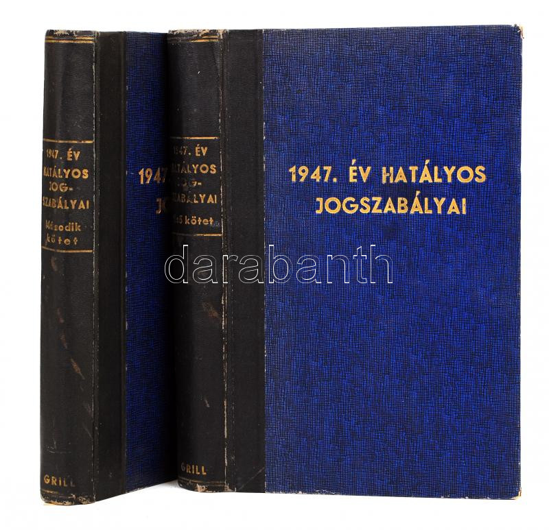 1947. év hatályos jogszabályai. Szerk.: Bacsó Ferenc et al. 1-2. köt. Bp., 1948, Grill Károly Könyvkiadóvállalata. Kicsit laza félvászon kötésben, egyébként jó állapotban.