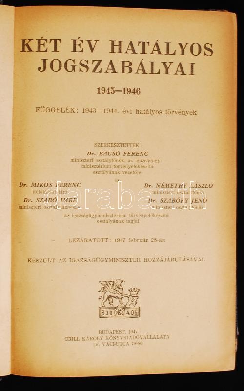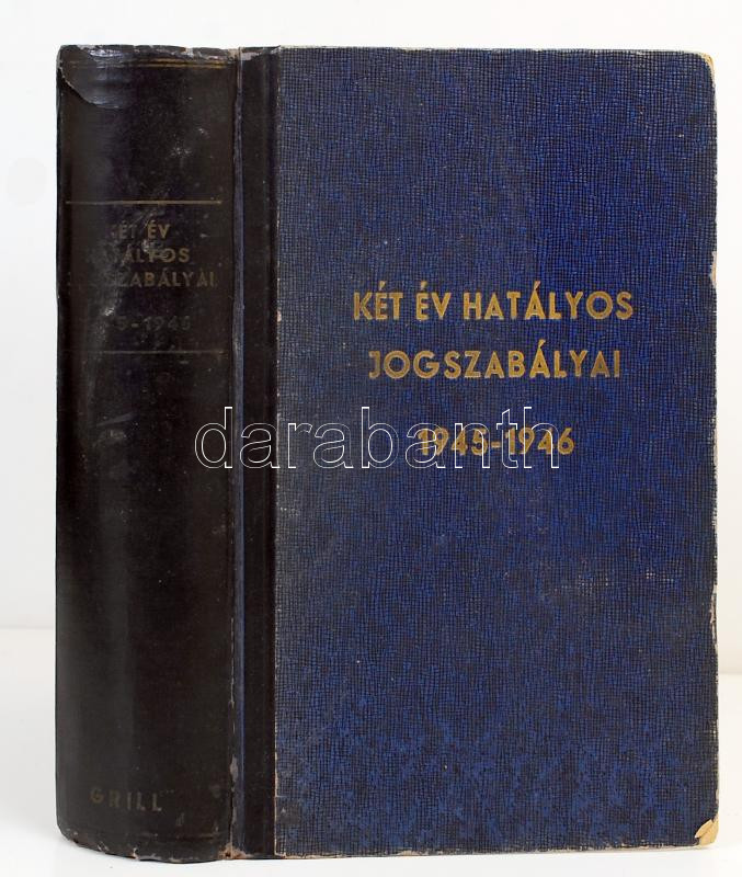 Két év hatályos jogszabályai 1945-1946. Függelék: 1-2. köt. 1943-1944. évi hatályos törvények. Szerk.: Bacsó Ferenc et al. Bp., 1947, Grill Károly Könyvkiadóvállalata. A két kötet egybekötve. Félvászon kötésben, jó állapotban.