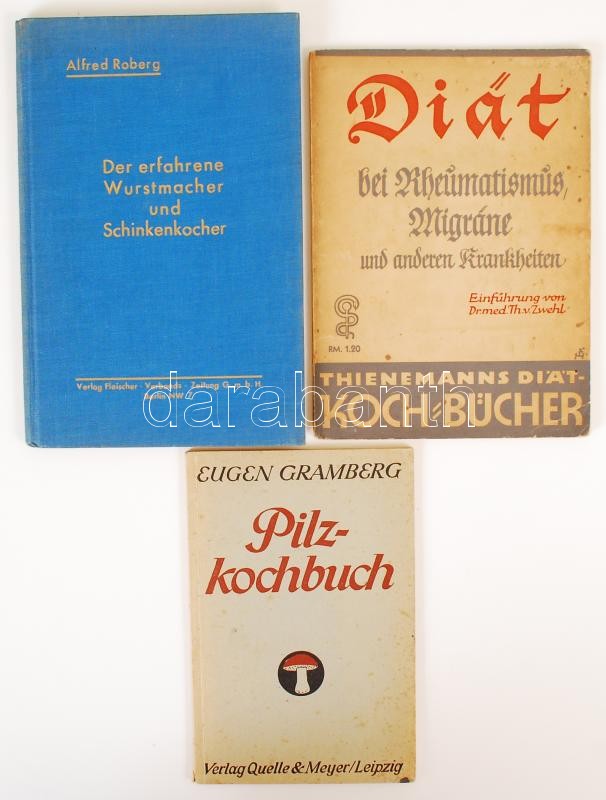 3 db kisalakú német szakácskönyv: Gramberg, Eugen: Pilzkochbuch. Leipzig, 1946, Verlag von Quelle & Meyer. Papírkötésben, jó állapotban.; Diät bei Rheumatismus, Migräne und einigen anderen Krankheiten. Stuttgart, é. n., K. Thienemanns Verlag.; ROberg, Alfred: Der erfahrene Wurstmacher und Schinkenkocher. Berlin, 1932, Verlag Fleischer-Verbands-Zeitung GmbH. Aranyozott vászonkötésben, jó állapotban.;