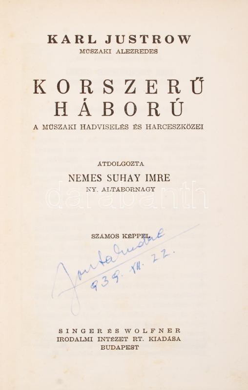 Justrow, Karl: Korszerű háború. Bp., [1939], Singer és Wolfner. Kicsit... https://www.darabanth.com/de/223-Fernauktion/223.0/Andere-Sammelgebiete/Bucher-Militaria~17/Justrow-Karl-Korszeru-haboru-Bp-1939-Singer-es-Wolfner-Kicsit-kopott-vaszonkotesben-~II974988