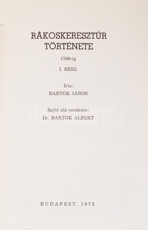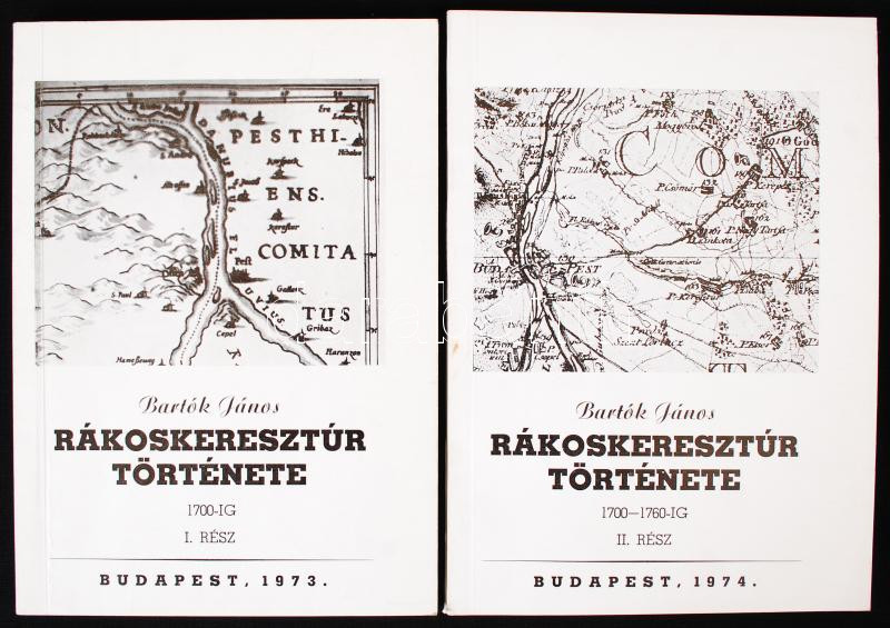 Bartók János: Rákoskeresztúr története I-II. kötet. I. rész:1700-ig, II. rész 1700-1760-ig. Budapest, 1974-74, Rákosmenti Füzetek. Kiadói papír kötésben. Korának megfelelő állapotban.