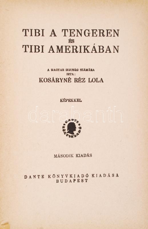 KOSÁRYNÉ RÉZ Lola: Tibi a tengeren és Tibi Amerikában. Bp., é.n., Dante. Rajzos illusztrációkkal. Színes, kiadói karton kötésben. Gerinc kissé viseletes, egyébként jó állapotú.