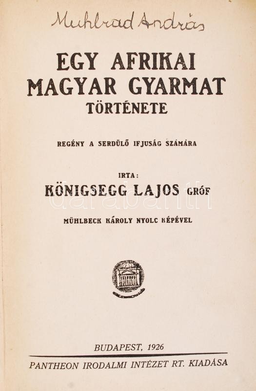 Königsegg Lajos: Egy afrikai magyar gyarmat története. Bp., 1926, Pantheon Irodalmi Intézet Rt. Kopott vászonkötésben, egyébként jó állapotban.