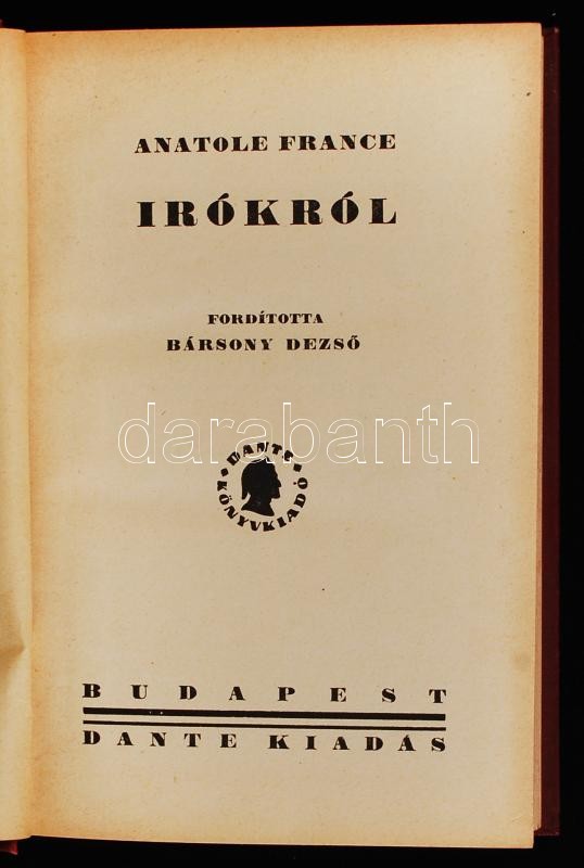 Anatole France: Írókról. Bp., [1925], Dante Könyvkiadó. Kicsit kopott ... https://www.darabanth.com/de/223-Fernauktion/223.0/Andere-Sammelgebiete/Bucher-Sonstige-Raritaten~40/Anatole-France-Irokrol-Bp-1925-Dante-Konyvkiado-Kicsit-kopott-diszes-vaszonkotesben~II943875