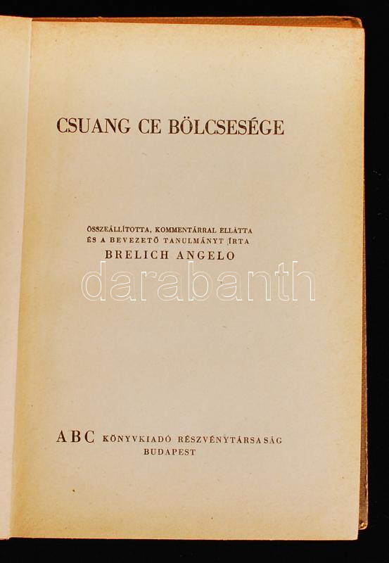 Csuang Ce bölcsessége. Összeáll.: Brelich Angelo. Bp., 1944, ABC Könyv... https://www.darabanth.com/de/223-Fernauktion/223.0/Andere-Sammelgebiete/Bucher-Sonstige-Raritaten~40/Csuang-Ce-bolcsessege-Osszeall-Brelich-Angelo-Bp-1944-ABC-Konyvkiado-Rt-Kartonalt-pap~II945205