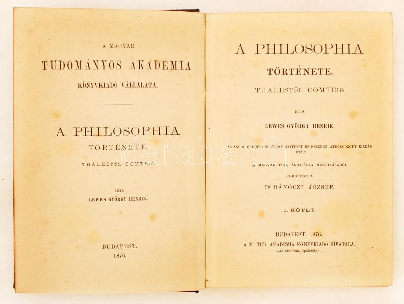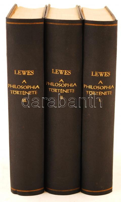 Lewes, György Henrik [George Henry]: A philosophia története Thalestől Comteig. I-III. köt. Bp., 1876, Magyar Tudományos Akadémia. Aranyozott gerincű vászonkötésben, jó állapotban.