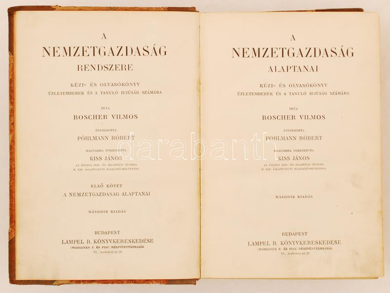 Roscher Vilmos: A nemzetgazdaság alaptanai. Kézi- és olvasókönyv üzletemberek és a tanuló ifjúság számára. Bp., [1912], Lampel Róbert. Kicsit laza félvászon kötésben, egyébként jó állapotban.