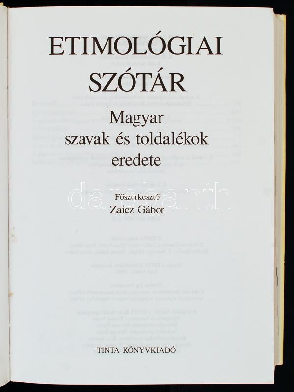 Zaicz Gábor (szerk): Etimológiai szótár. magyar szavak és toldalékok eredete. Budapest, 2006, Tinta Könyvkiadó. Kiadói karton kötésben, fedőborítóval, jó állapotú