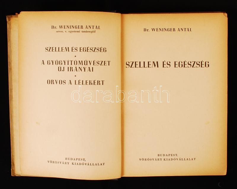Weninger Antal: Szellem és egészség. Bp., 1941, Vörösváry Kiadóvállala... https://www.darabanth.com/de/223-Fernauktion/223.0/Andere-Sammelgebiete/Bucher-Wissenschaft-und-Technik~19/Weninger-Antal-Szellem-es-egeszseg-Bp-1941-Vorosvary-Kiadovallalat-Felvaszon-kotes~II918991