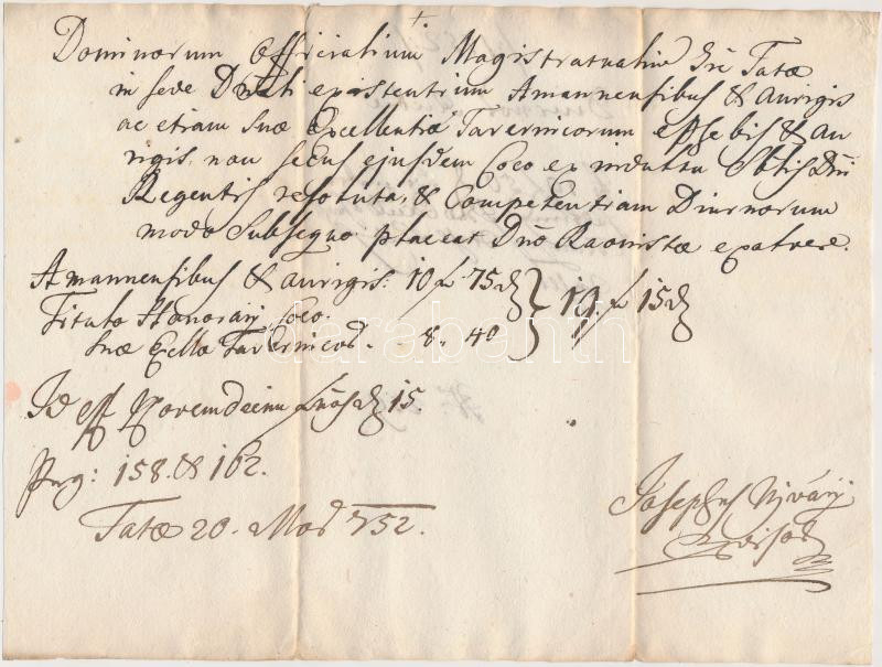 1752 Kifizetési igazolás tatai kocsisok és tiszttartók részére, latin ... https://www.darabanth.com/de/223-Fernauktion/223.0/Andere-Sammelgebiete/Dokument~31/1752-Kifizetesi-igazolas-tatai-kocsisok-es-tiszttartok-reszere-latin-nyelven~II975702