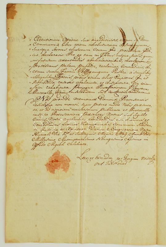 Beschreibung: 1797 Máramarossziget, Máramaros vármegye közgyűlésének oklevele megyei ügyekben, latin nyelven, rányomott viaszpecsét nyomával