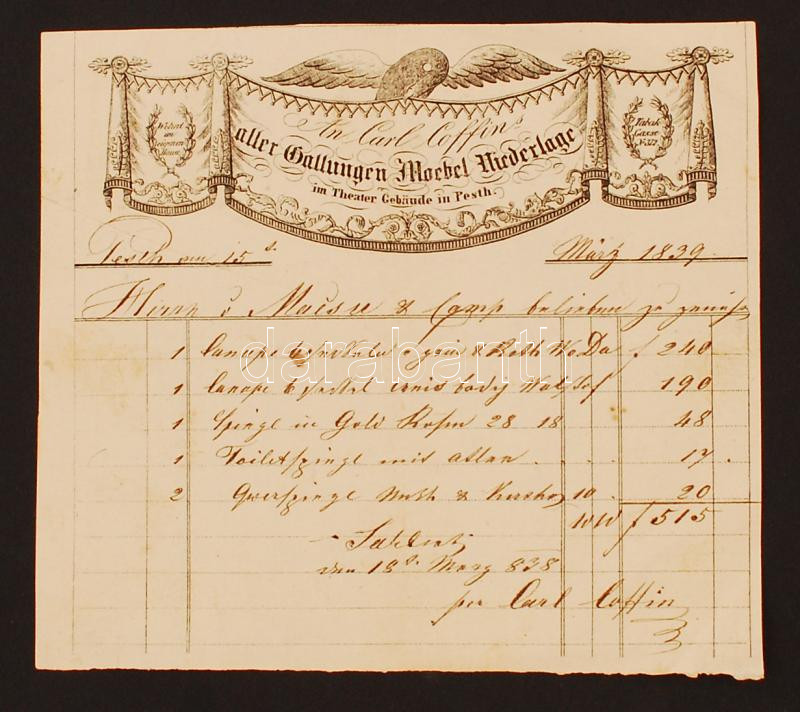 Beschreibung: 1839 Pest, A "Moebel Niederlage im Theater Gebäude in Pesth" (bútorkereskedés Pesten a színházépületben) díszes fejléces számlája