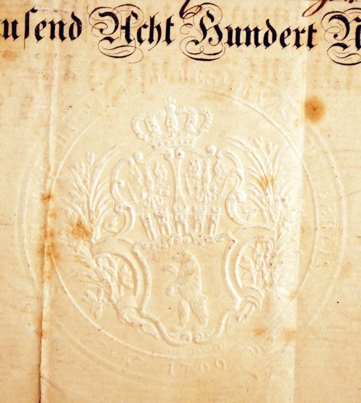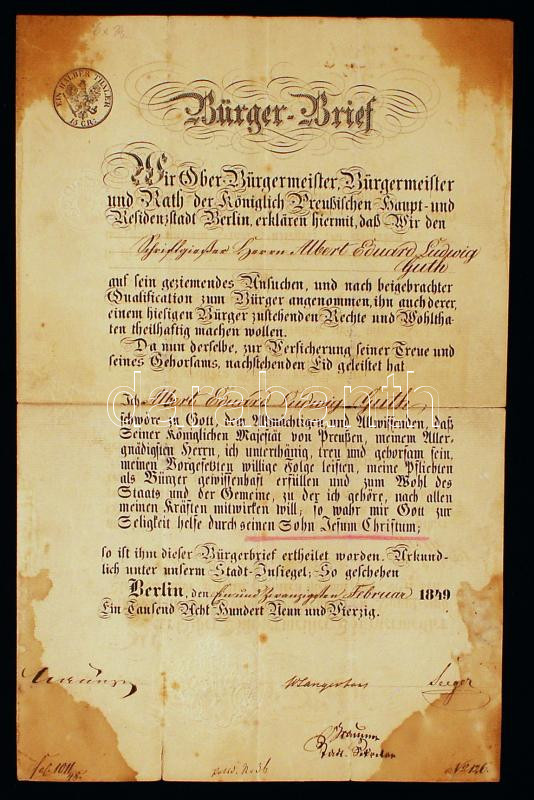 1849 Bürger Brief. Eskütétel szövegével kiegészített díszpolgárrá avatás oklevele, amelyet Albert Eduard Ludwig Guth király iránti hűségével érdemelt ki 1849-ben, Berlinben. Berlin száraz pecsétjeivel. A hajtás mentén szakadt. 37,5x24cm
