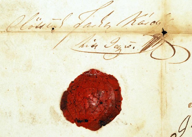 Beschreibung: 1856 Atyafiságos egyezkedés Jámbor Mihály hátrahagyott vagyonának elosztásáról. Szérűs kert eladásról szóló kiegészítéssel. Töredezett családi viaszpecséttel. 34x21cm