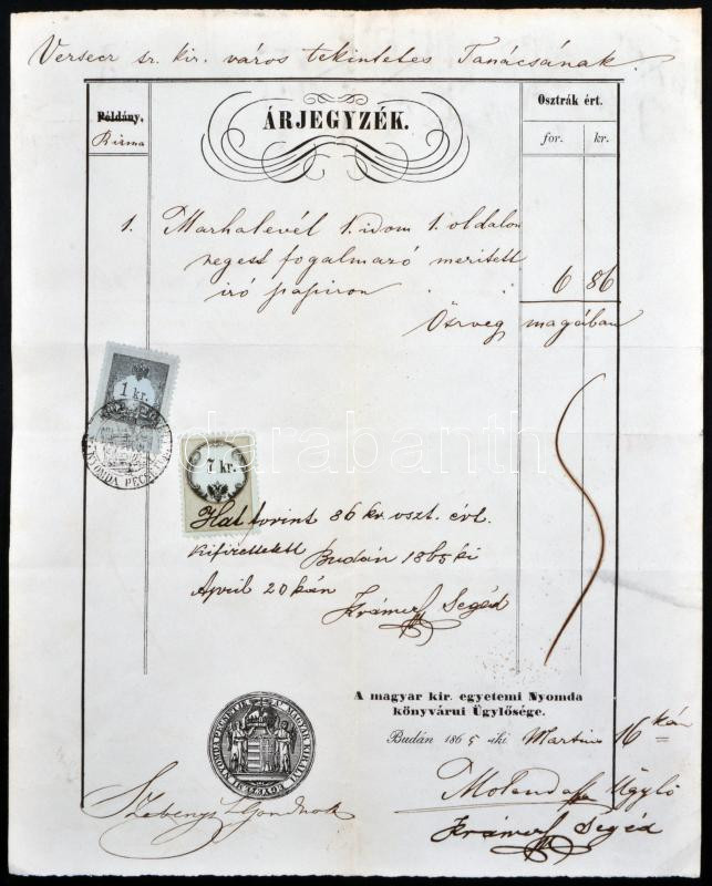 Beschreibung: 1865 A Királyi Magyar Egyetemi Nyomda számlája Versec városának marhalevelek készítéséről