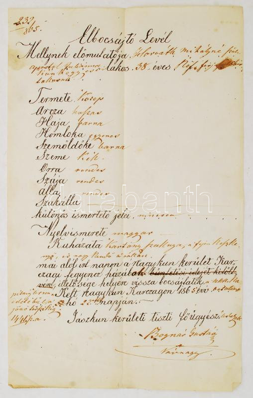 1865 Elbocsájtó levél nő részére fegyenc házból illetősége szerinti helyére való vissza bocsájtással. Kelt, Nagykun Karczagon, 1865. Bognár Géza Várnagy aláírásával. 34x20,5cm
