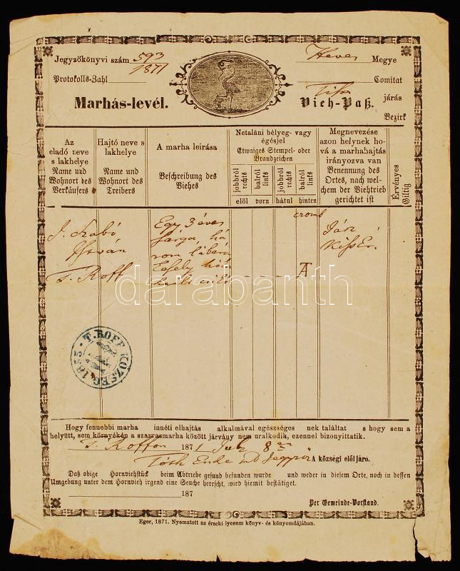 1871 1 db régi marhalevél https://www.darabanth.com/de/223-Fernauktion/223.0/Andere-Sammelgebiete/Dokument~31/1871-1-db-regi-marhalevel~II974081