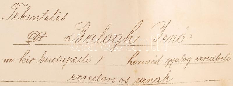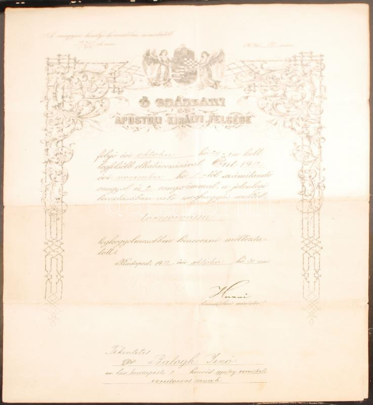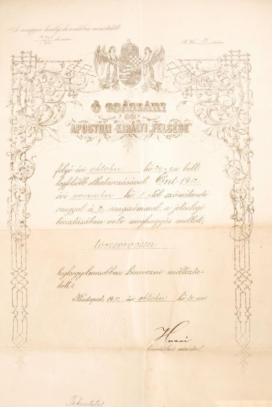 1912 Budapest ezredesorvos kinevezése főtörzsorvossá. Magyar Királyi Honvédelmi Miniszter száraz pecsétjével. Hazai Samu honvédelmi miniszter aláírásával. / 1912 Announciation of military doctor
