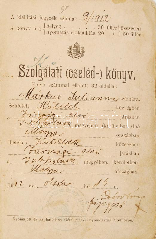 1912 Kőtelek, Szolgálati (cseléd-)könyv, bejegyzésekkel, viaszpecsétte... https://www.darabanth.com/de/223-Fernauktion/223.0/Andere-Sammelgebiete/Dokument~31/1912-Kotelek-Szolgalati-cseled-konyv-bejegyzesekkel-viaszpecsettel~II974452