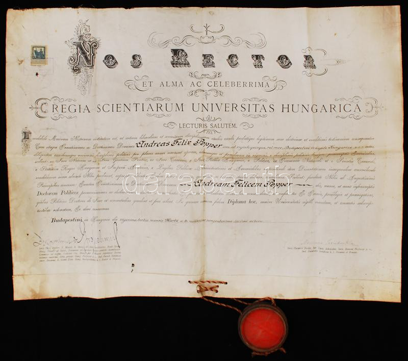 1918 Latin nyelvű, vászon, Állam és jogtudomány Doctori Diploma. Fölülbélyegezve K. M. Tud. Egyetemi Rectori Hivatal. Szép állapotú 7,5cm átmérőjű függőpecséttel illetve 3 koronás illetékbélyeggel, ellátva. Budapest. 49,5x66cm