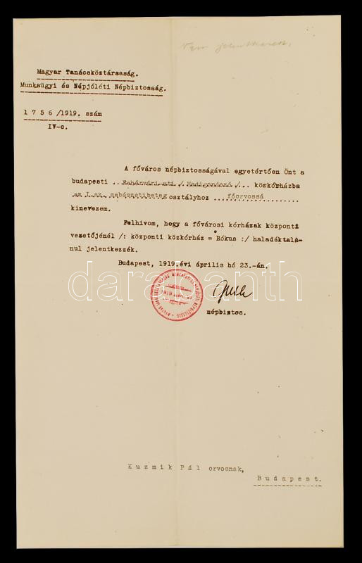 Beschreibung: 1919 Bp., A Magyar Tanácsköztársaság Munkaügyi és Népjóléti Népbizottsága által kiállított főorvosi kinevezési okmány