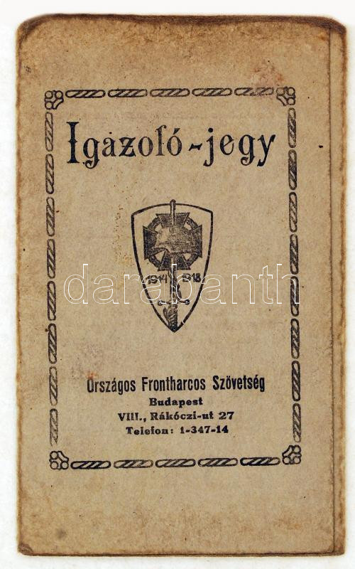 1929 Bp., Országos Frontharcos Szövetség által kiállított fényképes ig... https://www.darabanth.com/de/223-Fernauktion/223.0/Andere-Sammelgebiete/Dokument~31/1929-Bp-Orszagos-Frontharcos-Szovetseg-altal-kiallitott-fenykepes-igazolo-jegy~II972048