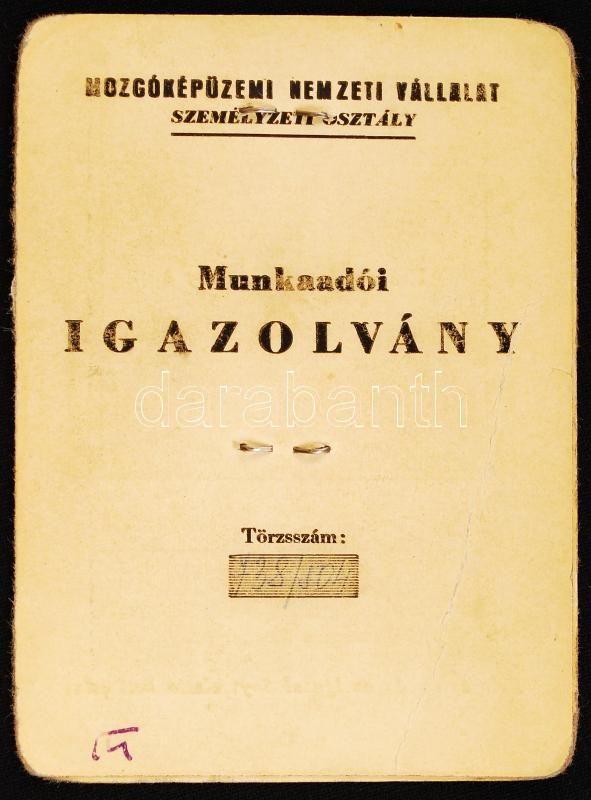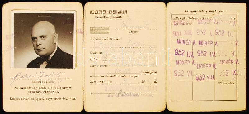 1951-1952 A Mozgóképüzemi Nemzeti Vállalathoz szóló munkaadói fényképe... https://www.darabanth.com/de/223-Fernauktion/223.0/Andere-Sammelgebiete/Dokument~31/1951-1952-A-Mozgokepuzemi-Nemzeti-Vallalathoz-szolo-munkaadoi-fenykepes-igazolvany~II931576