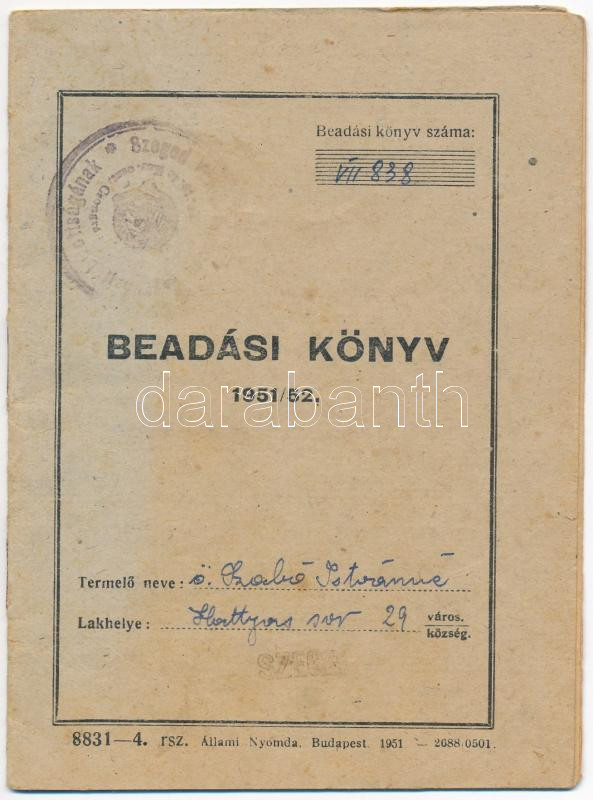 1951-1952 Névre szóló, kitöltött beadási könyv https://www.darabanth.com/de/223-Fernauktion/223.0/Andere-Sammelgebiete/Dokument~31/1951-1952-Nevre-szolo-kitoltott-beadasi-konyv~II975768