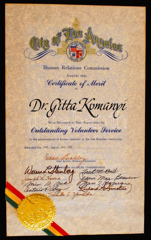 1982 Los Angeles városának Emberi Erőforrások Bizottsága által adományozott, önkéntességről szóló kitüntetés /