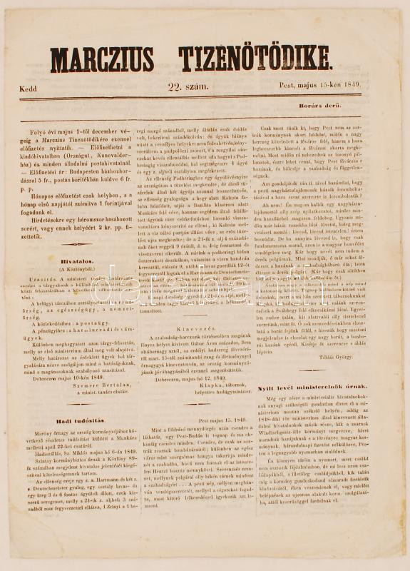 1849 A Márczius Tizenötödike című újság május 15-i száma a szabadságha... https://www.darabanth.com/de/223-Fernauktion/223.0/Andere-Sammelgebiete/Drucksachen~7/1849-A-Marczius-Tizenotodike-cimu-ujsag-majus-15-i-szama-a-szabadsagharc-hireivel~II973156